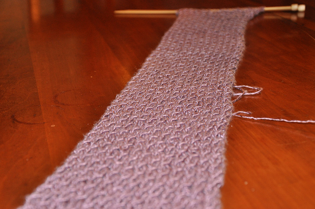 The scarf is supposed to measure 70″. That’s a whole lots of knitting. I have worked on it off and on since summer 2009 and last weekend, I finally finished the thing. It needs to be blocked but I’m waiting for a calm moment and then I will have some friends over to help me. Did I mention that 70″ is a lot of knitting??!?!?!