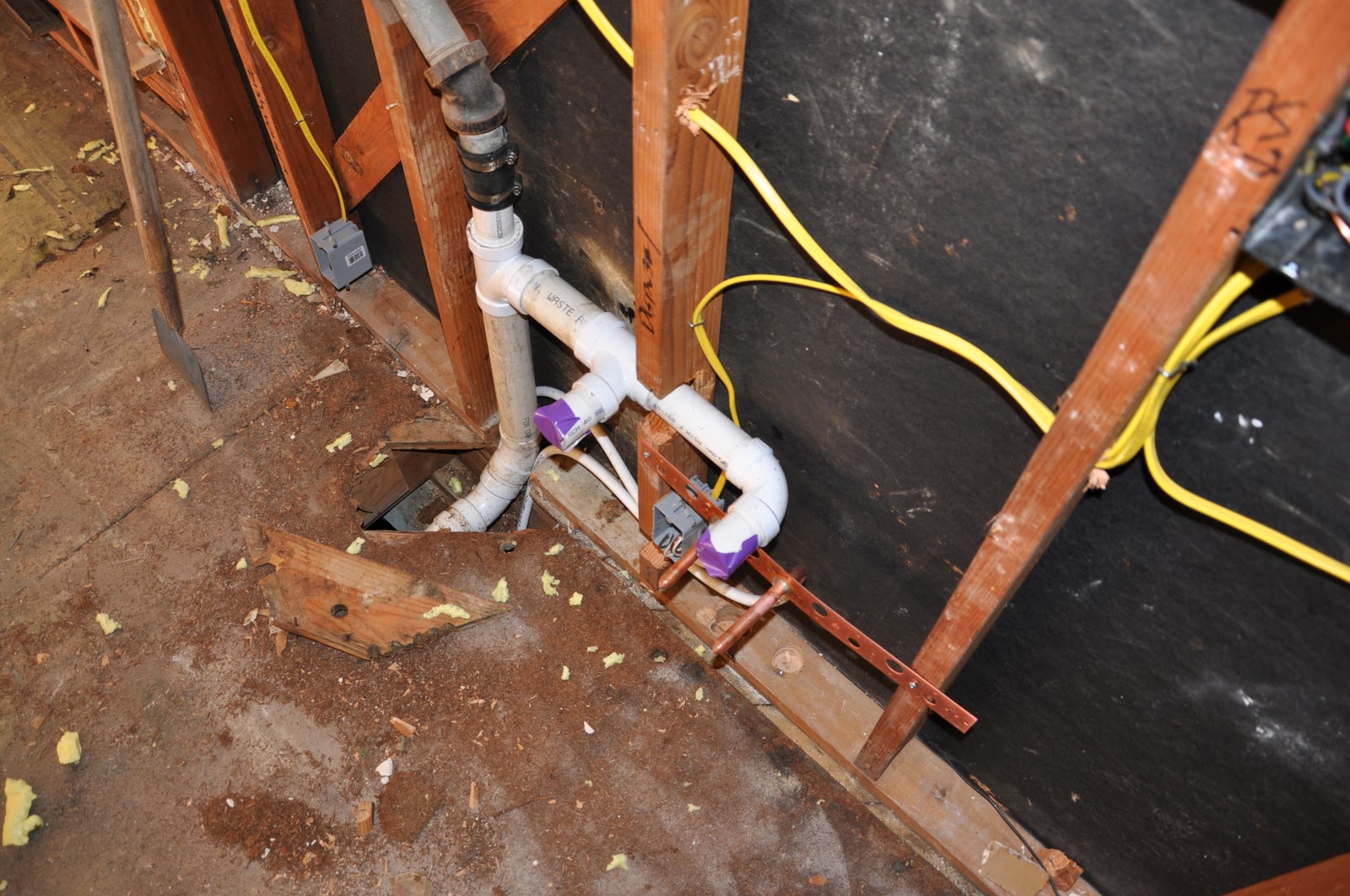 It may be hard to tell from the picture above but the white PVC pipe is our new drain lines for the kitchen and the new copper pipe are the new water pipes for the sink. This picture also shows the new yellow electrical wire and the new electrical boxes. We are going from one usable outlet for small appliances to 7 new outlets all over the kitchen!!! We have learned a lot about the new way of doing plumbing and electrical. We will have a drain for each side of the sink instead of two drains coming into a P-trap. Also our appliances that need electricity are not hard wired anymore but they are a plug just like the refrigerator.