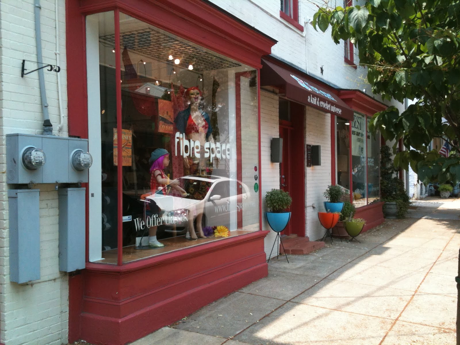 I had heard about Old Town Alexandria but had never been there. It seemed that on other trips to DC, I always ended up in Georgetown. But this time I was on a mission to go to fibre space. This wonderful, funky yarn shop is just a 10 minute walk from the Metro stop along the brick paved sidewalks of Old Town. The shop was everything you want in a LYS – friendly, knowledgeable staff; the perfect selection of various yarn weights, fibers and colors. Local yarns were identified with special tags and all yarns were labeled on the shelf as well as the skein. They had yarns and patterns that I had heard of but never touched/seen before. Like Spud & Chole. And Mirasol. They had t-shirts and tote bags for sale with the shop logo. And if you spent a certain amount, you got a free drawstring bag. Don’t know what the amount was but I spent it because I got a bag. The shop was wonderfully merchandised and there were 3 or 4 knitters sitting and knitting in the front of the shop (in the middle of the day on Friday!)