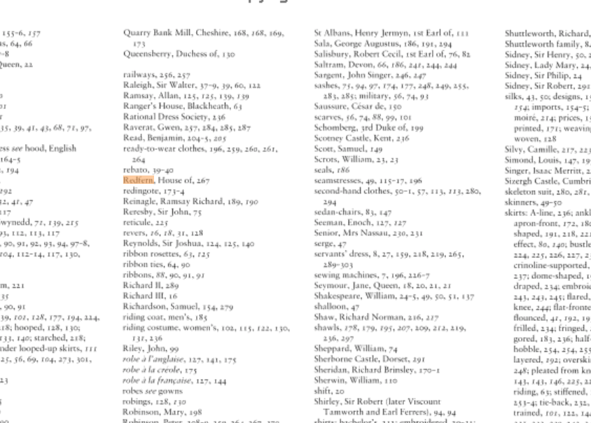 Gonna have to go to the library! Start with secondary sources. I’ll let you in on a little secret! Historians love a good index! Cuts down on the reading! So I looked through every index of every fashion history in the University of Arkansas at Little Rock Library and the Central Arkansas Library System. Looking for the name Redfern.
