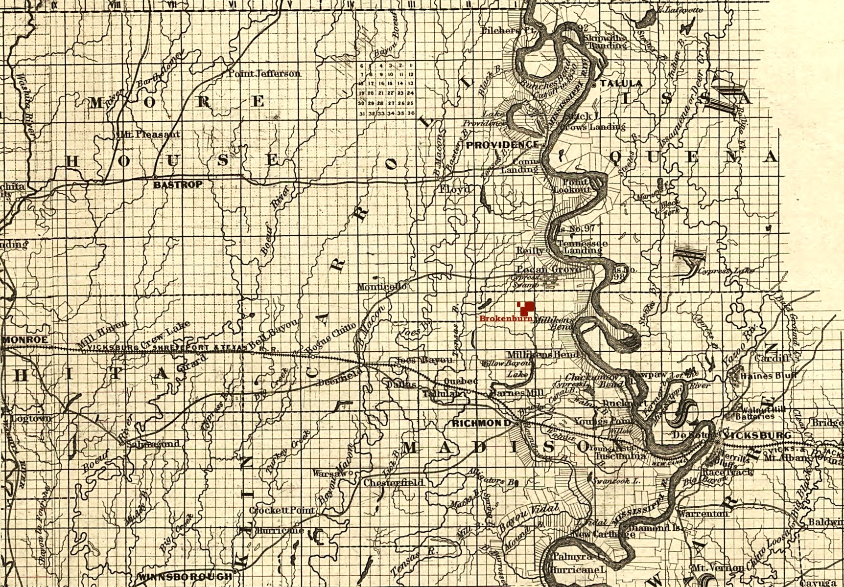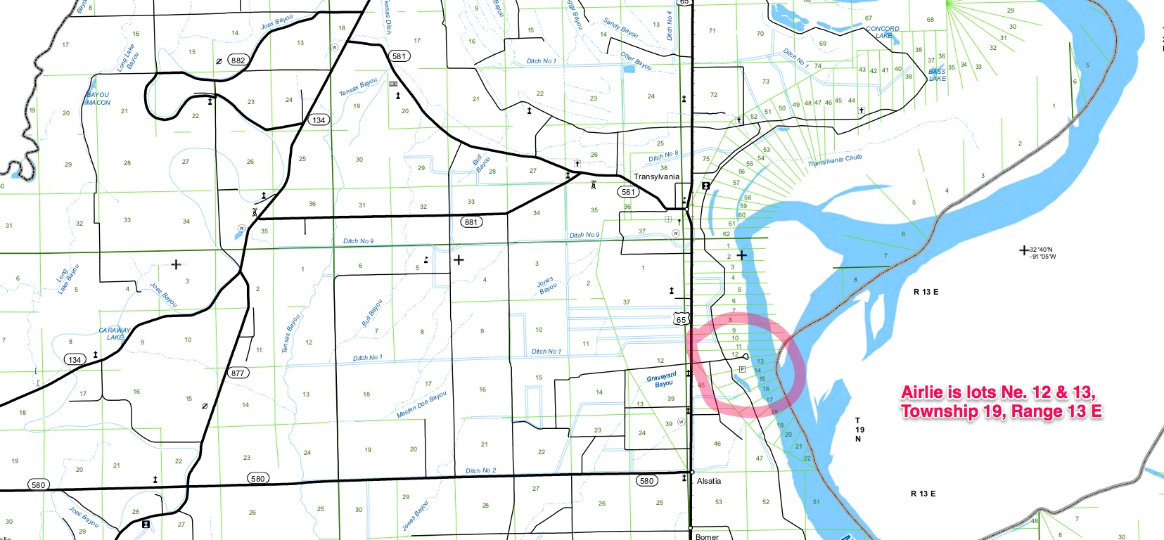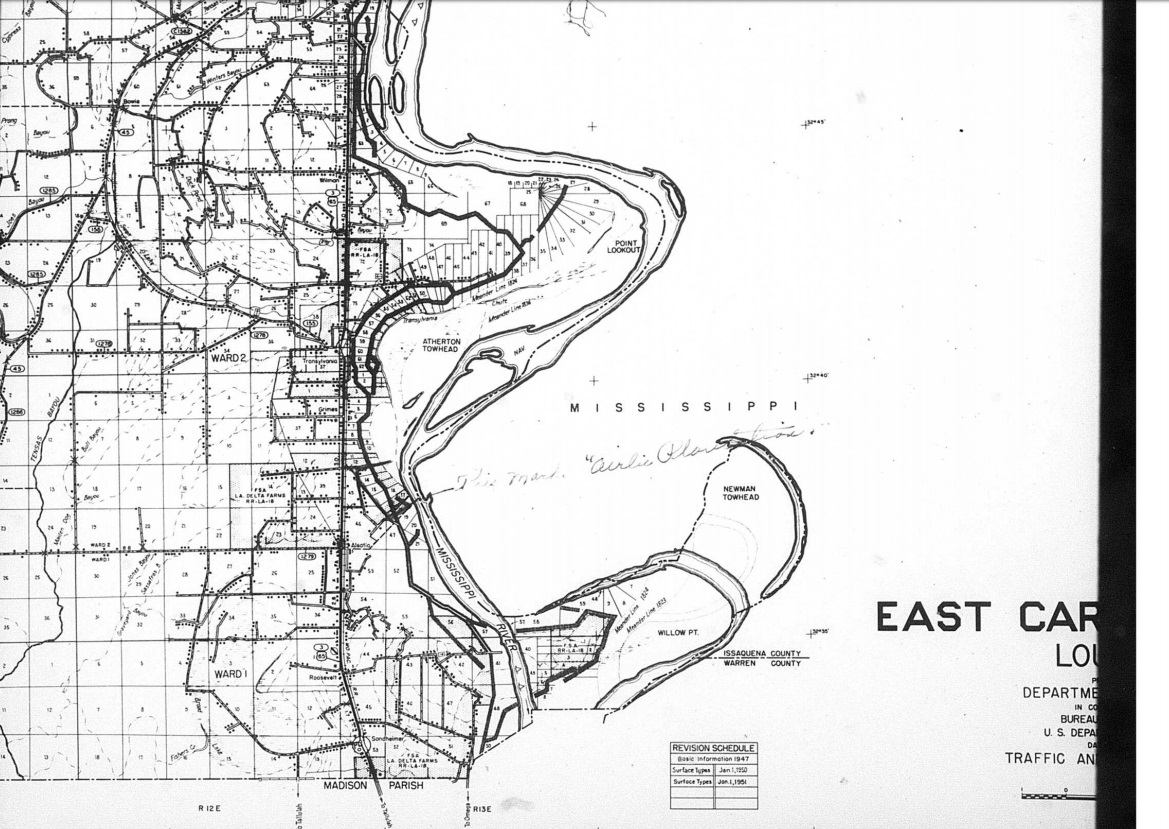 Way back in high school – in geology class – the teacher taught us how to use topo maps and how to find a specific tract of land by using township and range coordinates. It’s one of the many things I’m so glad I know. I went to the township maps for Louisiana. Found the map for East Carroll Parish.