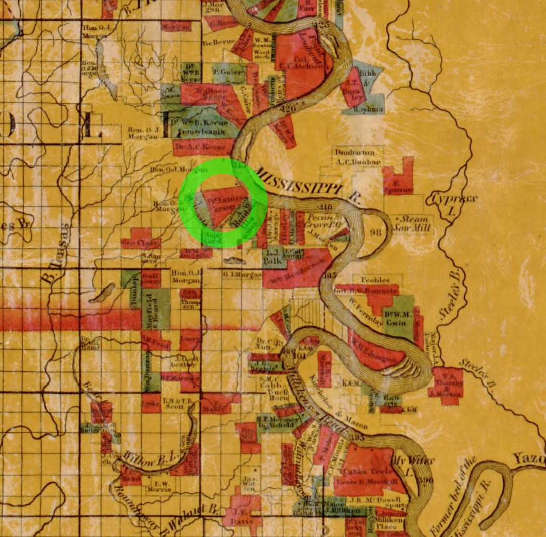 And right there, at Township 19 N, Range 13 E, Sections 12 &13 is the land James Green Carson bought from Mansel, White, and January in 1846. The “tract of land and Cotton Plantation” from the 1846 deed. It is the property he lived on until 1863 when the family escaped the advancing Union troops and fled to Texas. It was where KCB was born and where she grew up.