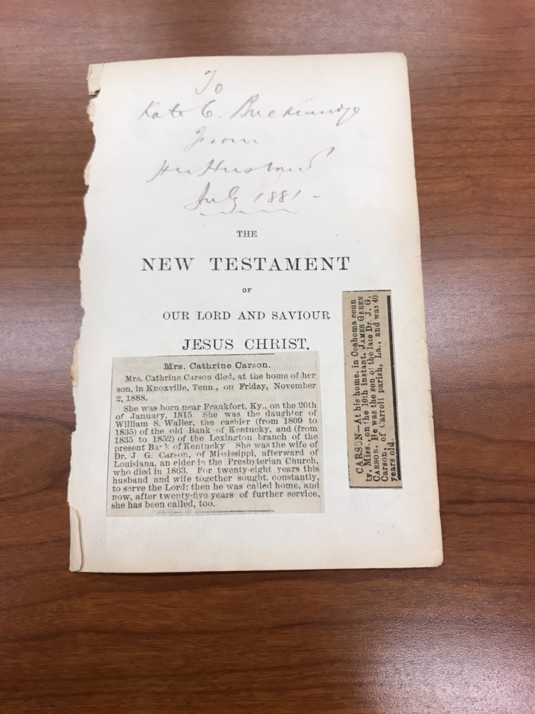 Container 862 includes letters to KCB from Clifton before their marriage. The title page of The New Testament of Our Lord and Savior Jesus Christ is one of the great things you can find tucked away in archival folders. Bibles are notoriously bad about disintegrating. And my guess is that this title page was removed from its Bible in order to save the important obituaries that were glued onto it. The longer of the two obituaries is for KCB’s mother Catherine Waller Carson. The other one is for KCB’s brother James Green Carson. The container also had letters from KCB’s daughter Lees and her son, Carson. And personal items from the Daughters of the American Revolution, including a note from Arkansas Chapter Secretary Martha Pratt.