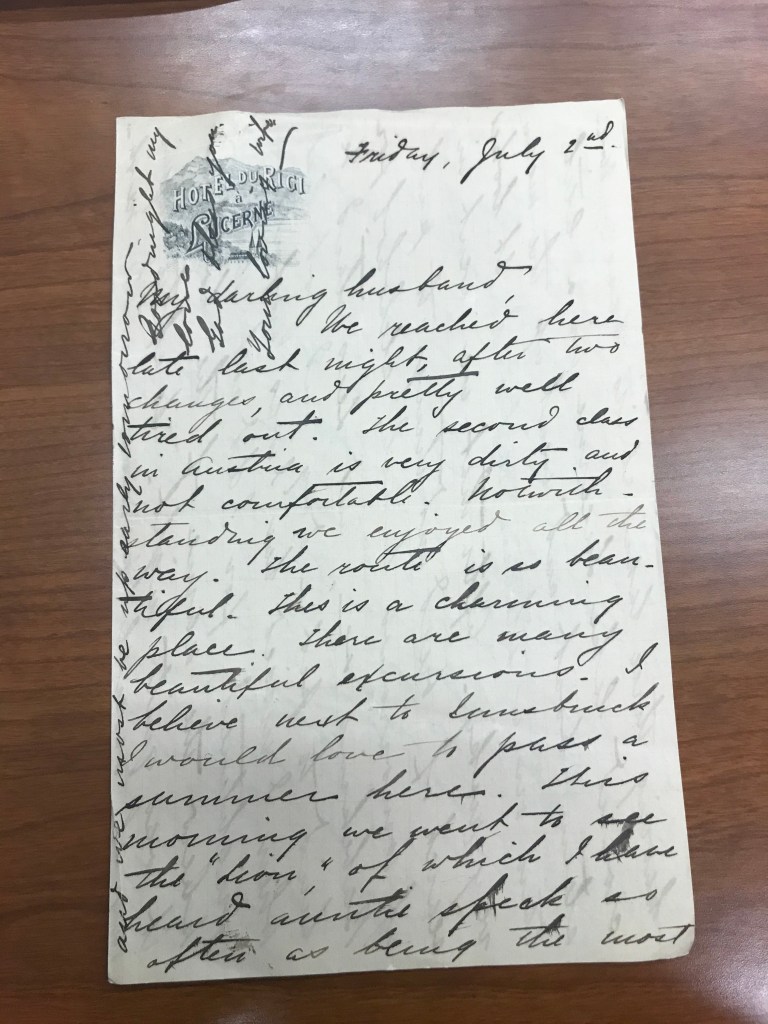 In my second pull (Containers 861/862/866), I went back to familiar territory. I’d visited Container 861 several times in the past but I wanted to get photographs of the two diaries listed there. Plus I wanted to get some good blog photos of letters I had transcribed on-site early on. The first diary has a solid black cover and KCB wrote her name on the inside cover along with “Room 3 – Neptune.” The second diary is slightly larger than the first and has a black and white checkered cover. Both are from KCB’s trip to Europe with Lees and Carson in August 1914. They were in Norway mostly but it will be interesting to see if she mentions anything about the assassination of Archduke Franz Ferdinand (June 28, 1914) and the start of World War I (July 28, 1914).
